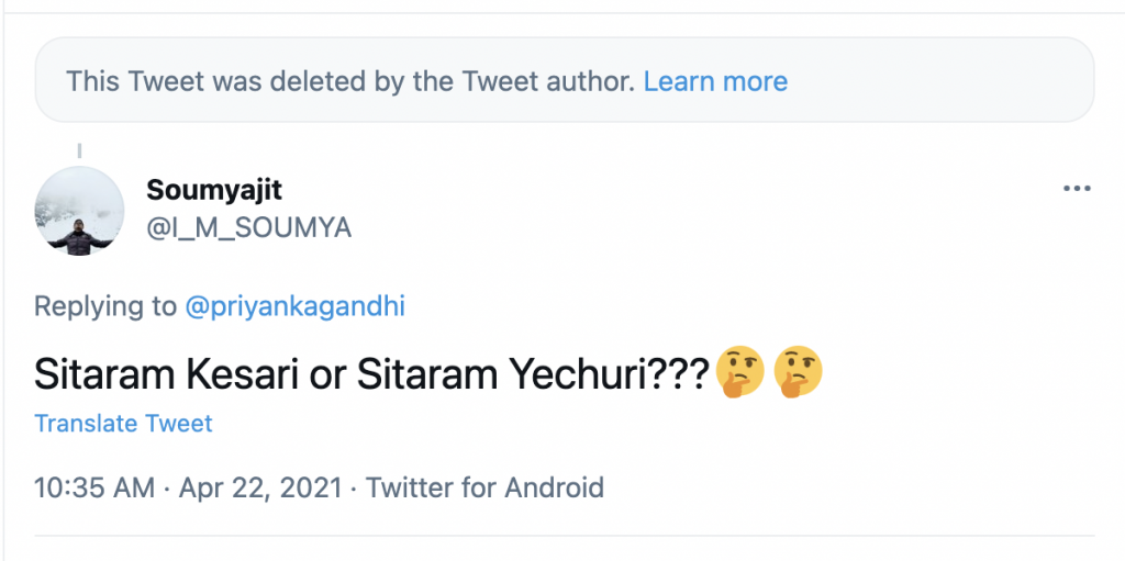 As one can see, a Twitter user had tried to correct Priyanka Gandhi whether it should Sitaram Kesari or Sitaram Yechury in her tweet. Original tweet of Priyanka Gandhi now stands deleted.