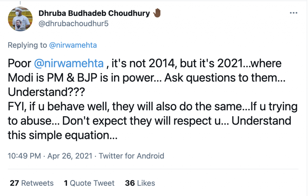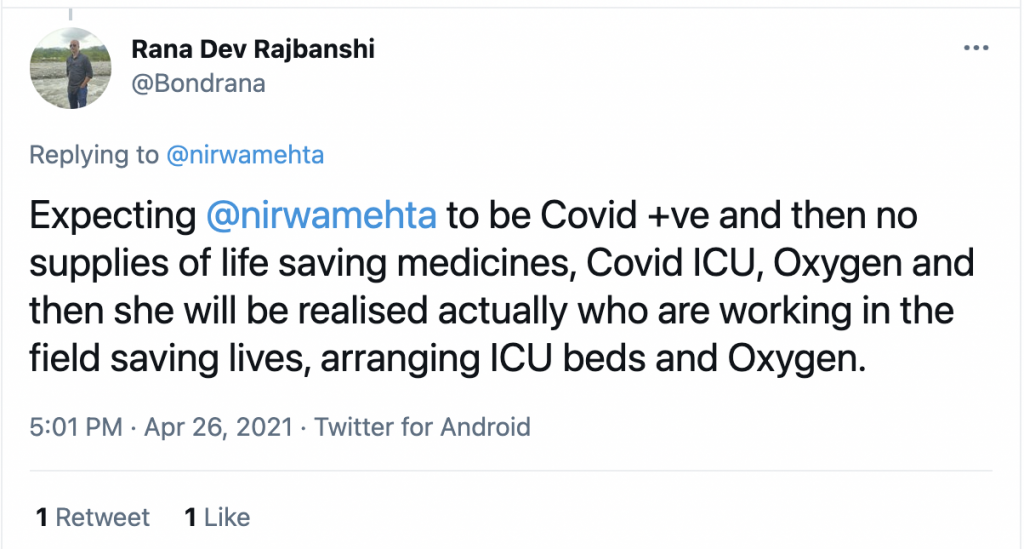Ah, a death wish. How can we forget. If Prime Minister and Home Minister of the country get death wished upon by Congress leaders, supporters and Congress loyalist ‘journalists’ and ‘influencers’, I am but just a regular citizens of India. So when Rana Dev Rajbanshi wished I get COVID positive, struggle for oxygen and medicines to ‘realise’ who are working in field, I did not get bothered.