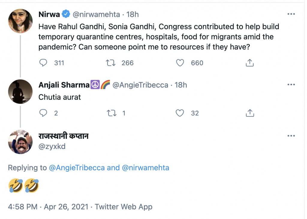 Twitter user ‘Anjali Sharma’ has over 11,000 followers and is followed by various Congress leaders like Pawan Khera, Alka Lamba and now left as Congress supporter Sanjay Jha. Anjali decided to abuse me and use derogatory word for me because I questioned the Gandhi family members. Other Congress supporters found it amusing and shared with laughing emojis.