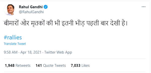 In a tweet, he said, “Bimaro aur mritako ki bhi itni bheed pehali baar dekhi hai (I have seen such a large crowd of infected and deceased people too for the first time).” Gandhi’s tweet was followed with the hashtag ‘#rallies’. The Congress dynast took potshots at the ruling BJP for its aggressive campaign ahead of the 6th phase of polls in West Bengal.