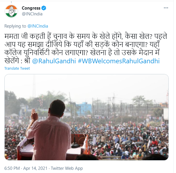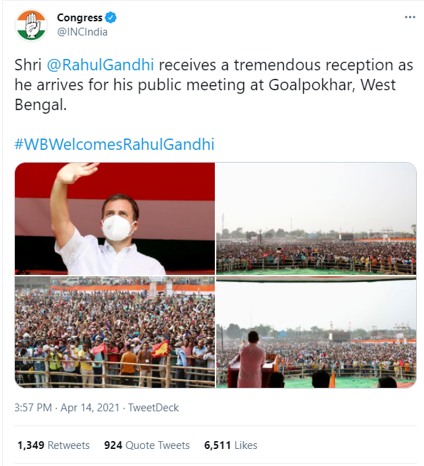 In a tweet on Wednesday (April 14), the official handle of the party tweeted, “Shri Rahul Gandhi receives a tremendous reception as he arrives for his public meeting at Goalpokhar in West Bengal.” The tweet was followed with the hashtag WBWelcomesRahulGandhi. The visuals, shared by the party, clearly showed how social distancing guidelines went for a toss during his rally.