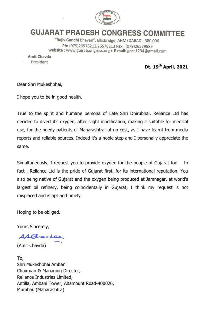 In the letter, Chavda applauded Reliance Industries for sending help to Maharashtra from its refinery in Jamnagar but expressed displeasure for ignoring Gujarat which takes pride in the company.