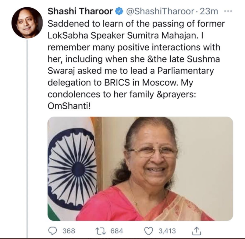 Late Thursday night, Shashi Tharoor took to Twitter and said, “Saddened to learn of the passing of former Lok Sabha Speaker Sumitra Mahajan. I remember many positive interactions with her, including when she and the late Sushma Swaraj asked me to lead a Parliamentary delegation to BRICS in Moscow. My condolences to her family and prayers: Om Shanti.”