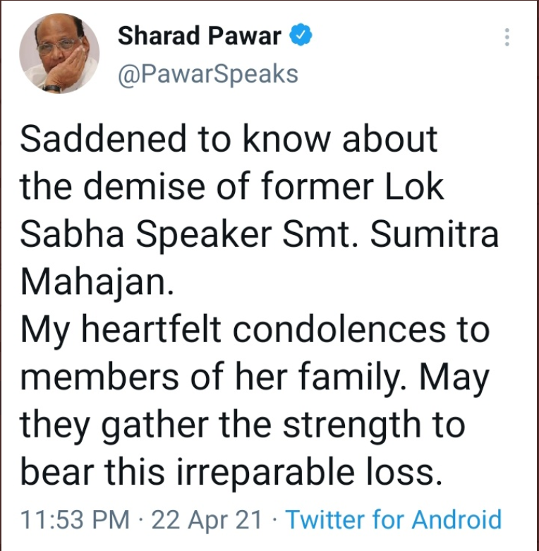 Following his tweet, several politicians such as NCP Chief Sharad Pawar and her daughter Supriya Sule joined the bandwagon to mourn the “death” of Sumitra Mahajan. Sharad Pawar wrote, “Saddened to know about the demise of former Lok Sabha Speaker Smt. Sumitra Mahajan. My heartfelt condolences to members of her family. May they gather the strength to bear this inseparable loss.”