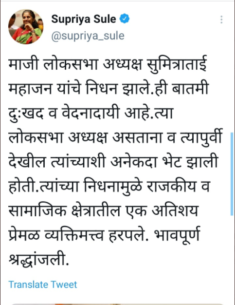 Supriya Sule also tweeted about the “demise” of the former Lok Sabha speaker.