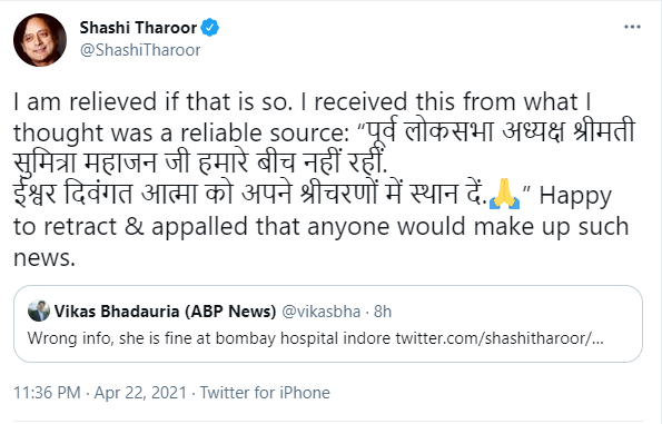 On Thursday (April 22) night, Congress leader Shashi Tharoor took to Twitter to spread fake news about the death of the former BJP Parliamentarian and ex-Lok Sabha Speaker Sumitra Mahajan.