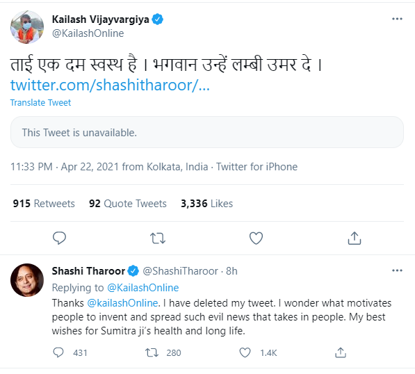 On learning that he had ‘inadvertently’ peddled fake news about Sumitra Mahajan’s death, the Congress leader replied, “Thanks Kailash Vijayvargiya. I have deleted the tweet. I wonder what motivates people to invent and spread such evil news that takes in people. My best wishes for Sumitra Ji’s health and long life.”