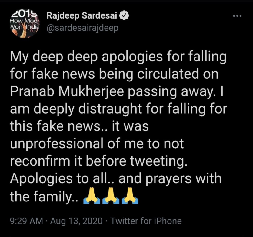 On being called out on social media, he tweeted, “My deep deep apologies for falling for fake news being circulated on Pranab Mukherjee passing away. I am deeply distraught for falling for this fake news. It was unprofessional of me not to reconfirm it before tweeting. Apologies to all and prayers with the family.”