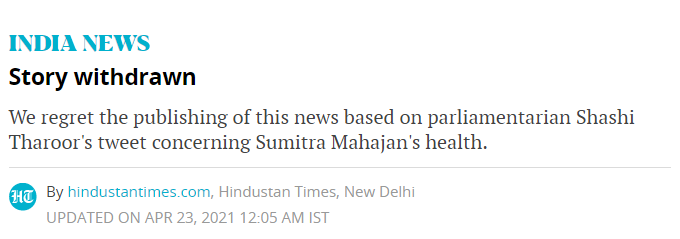 Hindustan Times, which had earlier cited Congress leader Shashi Tharoor as their source to claim the death of Sumitra Mahajan, has also apologised for their story. In a statement, it said, “We regret the publishing of this news based on parliamentarian Shashi Tharoor’s tweet concerning Sumitra Mahajan’s health.”