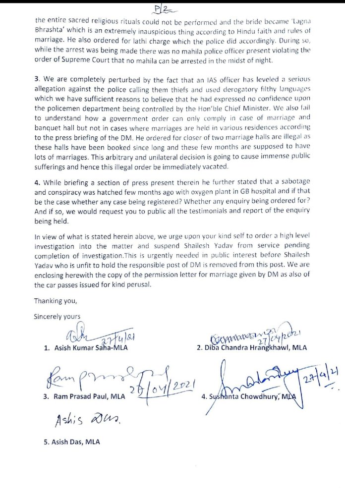 The five MLAs, in their letter, alleged that DM Shailesh Kumar Yadav had himself given permission for both the wedding ceremonies with the conditions that not more than 50 people can attend the marriage and four vehicles each would be allowed for which car passes had been issued. The letter alleged that both the marriages were conducted in full compliance with the COVID-19 protocols and regulations notified by the Centre and the state government and yet the DM raided and physically assaulted and abused the people, including the bride and the groom.
