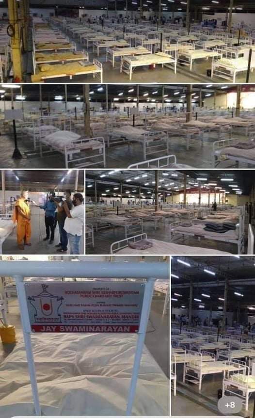 As new cases of Covid-19 surge in Gujarat, BAPS Swaminarayan Temple of Vadodara has converted its Yagnapurush Sabhagruh to a Covid-19 facility. The Covid-19 care centre is equipped with 500 beds, oxygen facilities like liquid oxygen tanks and piped oxygen lines, ICU beds and ventilators.
