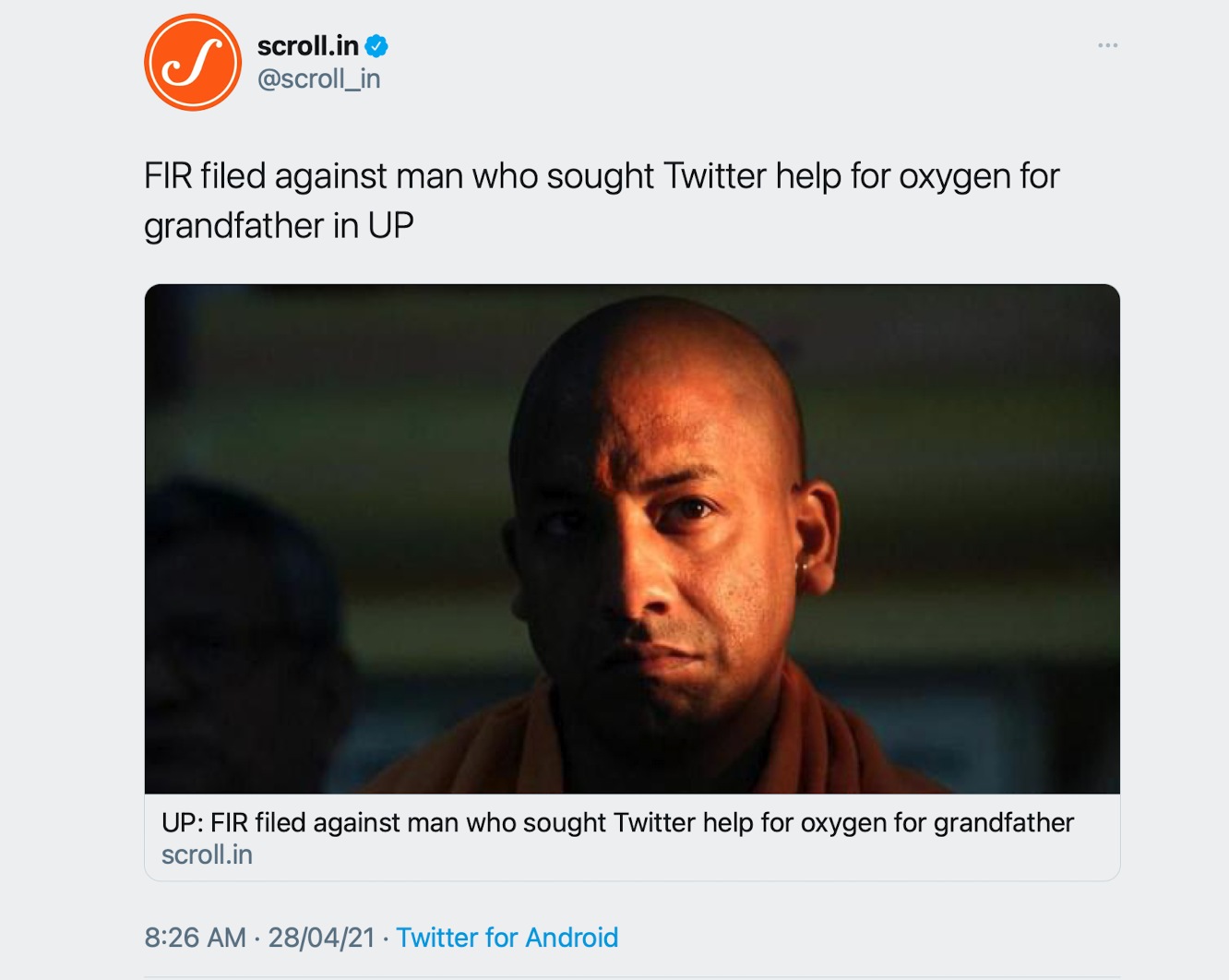 Scroll published an article titled ‘FIR filed against man who sought Twitter help for oxygen for grandfather in Uttar Pradesh’. The headline of the article suggested that the FIR was filed against a man simply because he used social media to seek help for oxygen for his grandfather.