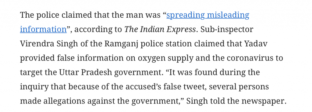 The article mentioned that an FIR has been filed against Shashank Yadav, who had yesterday posted a tweet seeking oxygen, on the charges of allegedly circulating a rumour with the intent to cause fear or alarm. Citing an Indian Express report, the Scroll article said police had claimed the man was spreading misleading information. The report even quoted the police officer who claimed that Yadav had provided false information on oxygen supply and the coronavirus to target the Uttar Pradesh government.