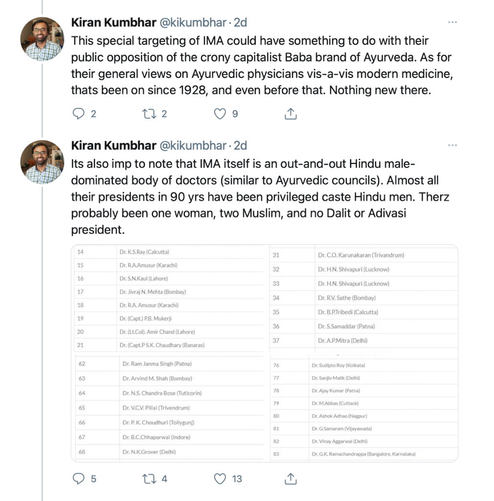 If this was not enough, Kumbhar then went on to share a list of people who have served as IMA presidents in 90 years to allege that the medical council body was an “out-an-out” Hindu dominated organisation. He then alleged that the concerns regarding the religiosity of Dr Jayalal are misguided as the IMA is largely a Hindu-dominated association, in a Hindu majority country.