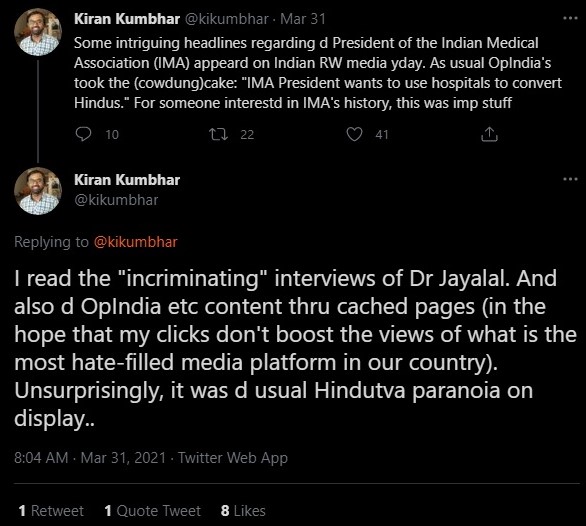 In a string of tweets, Kumbhar normalised IMA president Dr JA Jayalal’s extremely problematic opinions and his wish to convert doctors, students and patients to Christianity. Instead, he blamed “Hindutva paranoia” for faulting the IMA president of harbouring missionary zeal to convert people into Christianity.