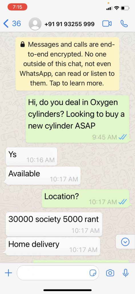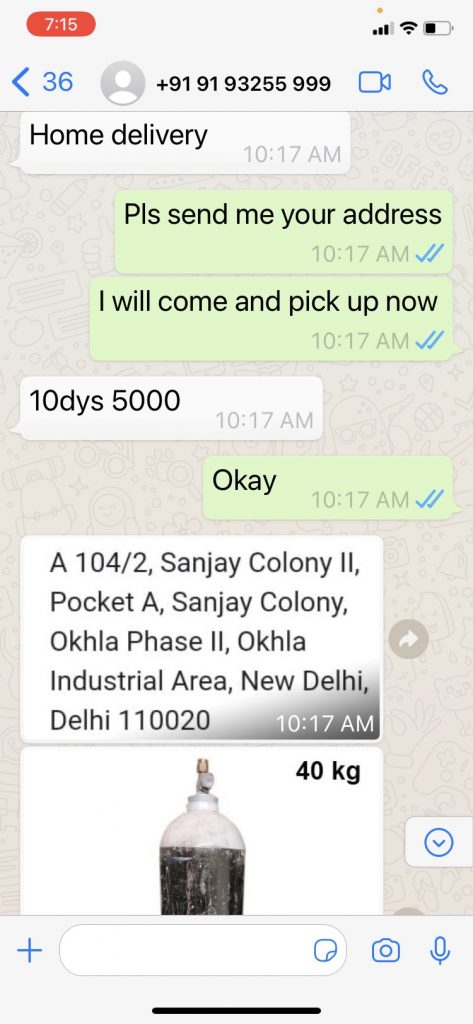 कल मैंने ऑक्सिजन सिलेंडर के लिए “रणवीर” नामक इस व्यक्ति से बात की। जब मैंने कहा मुझे तुरंत सिलेंडर चाहिए उस पर इसने मुझे कॉल किया और कहा की “आप 20 हज़ार एडवांस भेज दो मैं 4 घंटे में होम डिलिवरी करवा दूँगा।