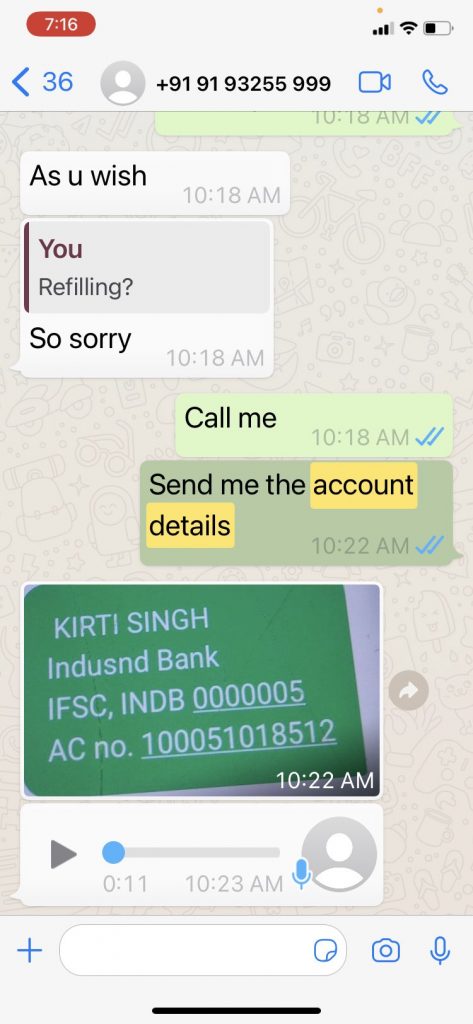 फिर वो मुझे एक महिला के बैंक अकाउंट का स्क्रीनशॉट भेजता है और साथ में एक वॉईज़ नोट भेजता है – “सर कल से 150 सिलेंडर डिलिवर करवा चुका हूँ आपको लेना है तो एडवांस भेजिए नहीं तो मुझे कोई ज़ोर ज़बरदस्ती नहीं है।”4/6@rohanduaTOI @arunbothra @abhijitmajumder @ABVPDelhi @TajinderBagga