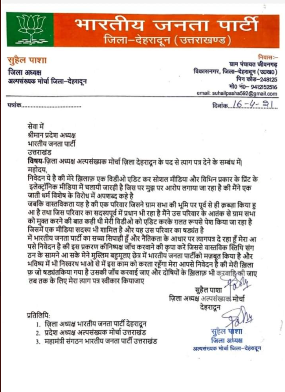 While submitting his resignation letter, Suhail Pasha further claimed that it is a ‘conspiracy’ against him. He demanded a fair investigation into the matter and said that the ‘real’ culprits should be punished. In his defence, he emphasised that he made the party stronger in Muslim-dominated area and requested the BJP Chief of Uttarakhand to accept his resignation.