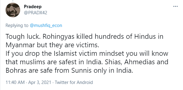 Twitter user Pradeep wrote, “Tough luck. Rohingyas killed hundreds of Hindus in Myanmar but they are victims. If you drop the Islamist victim mindset, you will know that Muslims are safest in India. Shias, Ahmedias and Bohras are safe from Sunnis only in India.”