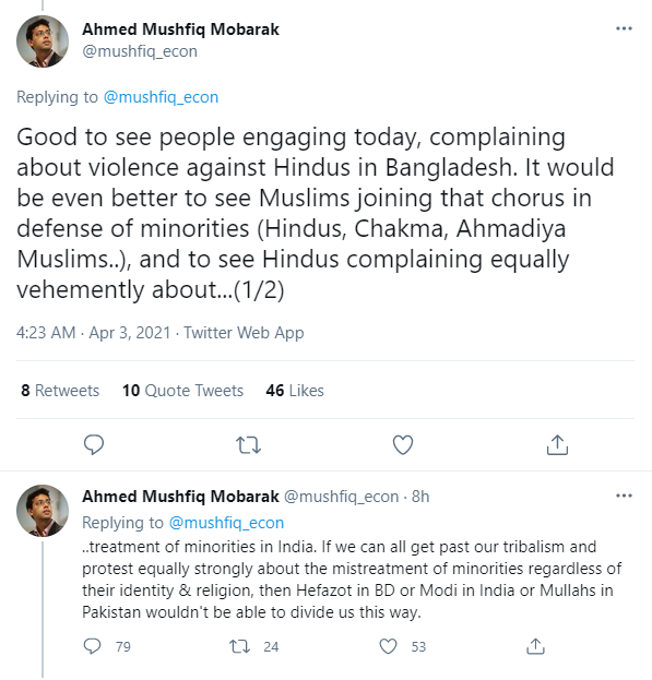 He further claimed, “If we can all get past our tribalism and protest equally strongly about the mistreatment of minorities regardless of their identity & religion, then Hefazat in BD or Modi in India or Mullahs in Pakistan wouldn’t be able to divide us this way.”