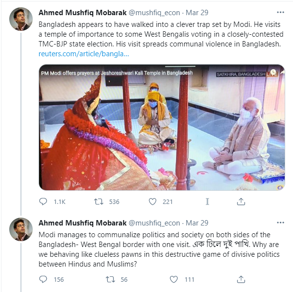 On Thursday (March 29), Mobarak tweeted, “Bangladesh appears to have walked into a clever trap set by Modi. He visits a temple of importance to some West Bengalis voting in a closely-contested TMC-BJP State election. His visit spreads communal violence in Bangladesh.” The Economics Professor tried to put the onus of the riots perpetuated by Islamists on the Indian Prime Minister.