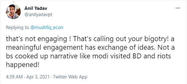 Twitter user Anil Yadav pointed out, “That’s not engaging! That’s calling out your bigotry! A meaningful engagement has an exchange of ideas. Not a BS cooked up narrative like Modi visited Bangladesh and riots happened!”