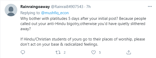 Another user pointed out the Yale Professor’s silence over 5 days. “Why bother with platitudes 5 days after your initial post? Because people called out your anti-Hindu bigotry, otherwise you’d have quietly slithered away? If Hindu/Christian students of yours go to their places of worship, please don’t act on your base and radicalised feelings,” wrote another user.