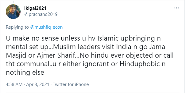 “You make no sense unless you have an Islamic upbringing and mental set up. Muslim leaders visit India and go to Jama Masjid or Ajmer Sharif. No Hindu ever objected or call that communal. You are either ignorant or Hinduphobic and nothing else,” a user pointed out the hypocrisy of the Economics Professor.