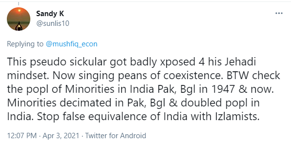 Sandy tweeted, “This pseudo sickular got badly exposed for his jihadi mindset. Now singing peans of coexistence. Btw, check the people of minorities in India, Pakistan, Bangladesh in 1947 and now. Minorites decimated in Pakistan, Bangladesh and doubled people in India. Stop false equivalence with Islamists.”
