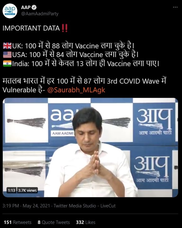 In a video statement released by the party, AAP MLA Saurabh Bharadwaj claims that 88% of the people in the United Kingdom have received the vaccine and the same is 84% for the United States of America. The number for India he cited was 13%.