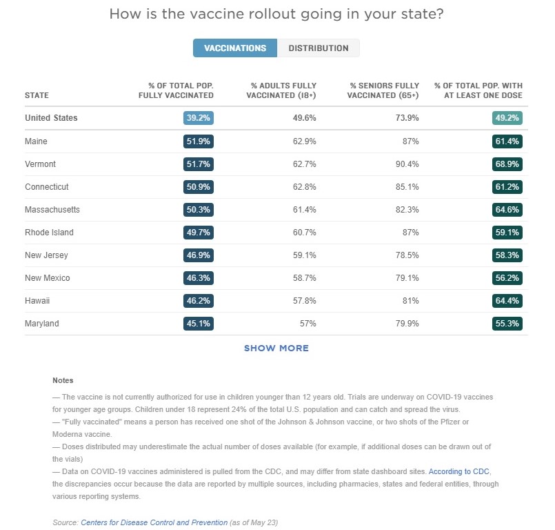 In USA, 49.2% of the population has received at least the first dose of the vaccine. 49.6% of adults have been fully vaccinated and the figure is 73.9% for those above 65 years of age. A total of 39.2% of the population has been fully vaccinated.