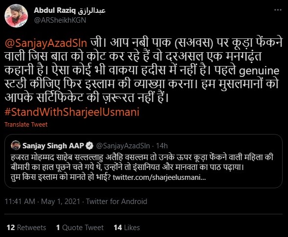 Sanjay Singh of the Aam Aadmi Party on Friday attempted to teach ‘true Islam’ to Sharjeel Usmani after the Newslaundry columnist celebrated the death of Aaj Tak news anchor Rohit Sardana. He recounted a story of how the prophet of Islam had responded with kindness to a woman who had earlier thrown garbage at him.