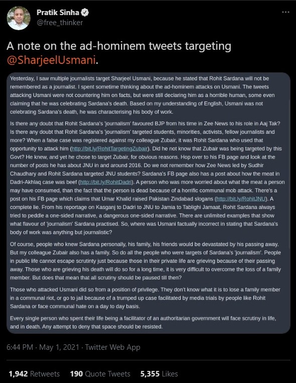 “The tweets attacking Usmani were not countering him on facts, but were still declaring him as a horrible human, some even claiming that he was celebrating Sardana’s death. Based on my understanding of English, Usmani was not celebrating Sardana’s death, he was characterising his body of work, said Pratik Sinha.