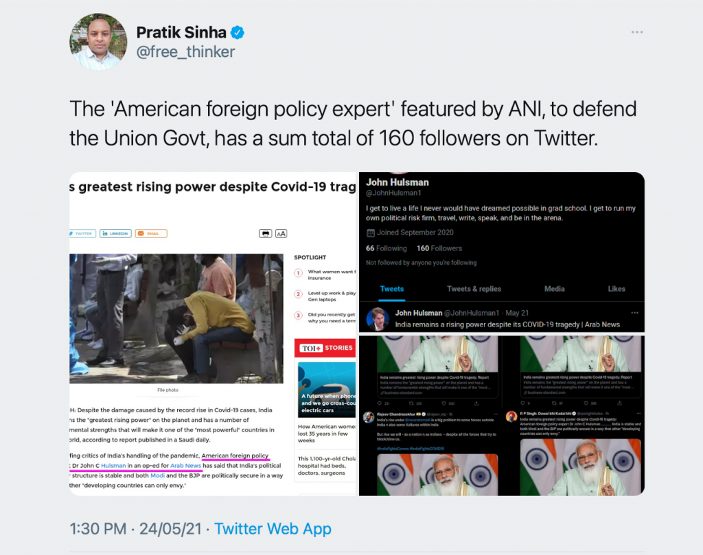 While Sinha raises questions on the credibility of the expert who praised the Indian government, it must be noted that Dr Hulsman is an esteemed foreign policy expert and the president and managing partner of John C. Hulsman Enterprises, a prominent global political risk consulting firm.