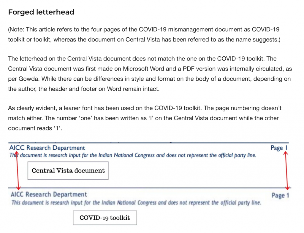 In its article, Alt News said the letterhead of the Central Vista document it received from the Congress party did not match with the one on the party’s COVID-19 toolkit and therefore the document was fake.