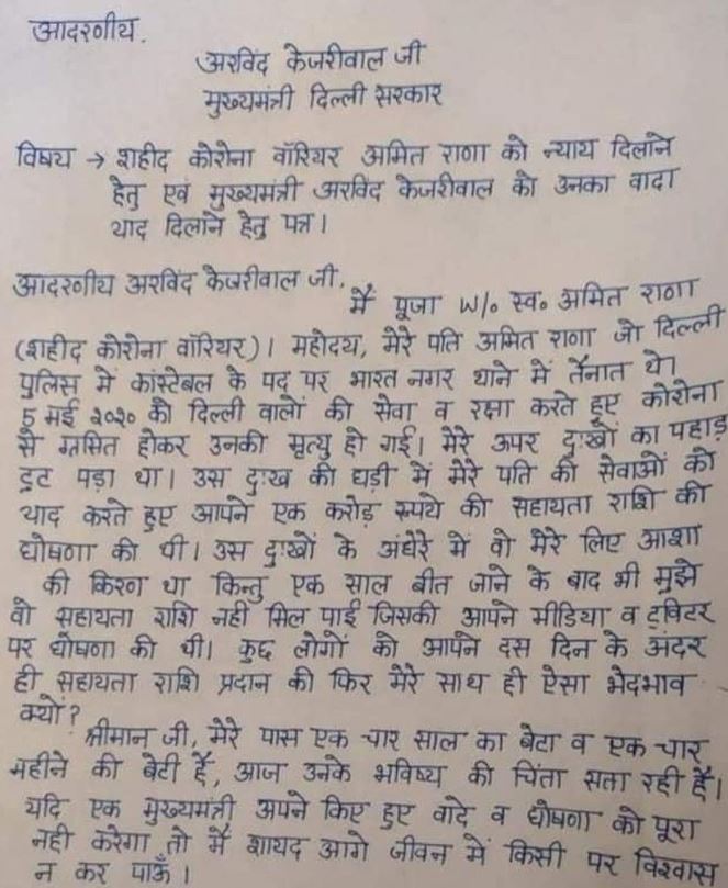 Reminding the CM of his commitment, Pooja wrote in Hindi, “My husband was a martyred corona warrior, and succumbed to the pathogen while serving the people of Delhi. I was filled with sorrow and dejection. In that hour of grief, acknowledging the sacrifices made by my husband, you assured me financial help of Rs 1 crore. You announced the same on Twitter and in front of the entire media. That gave me some hope. However, we never received that amount.”