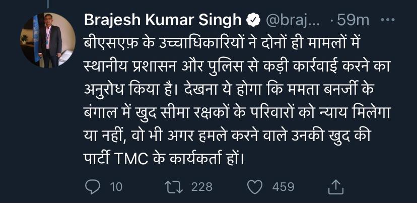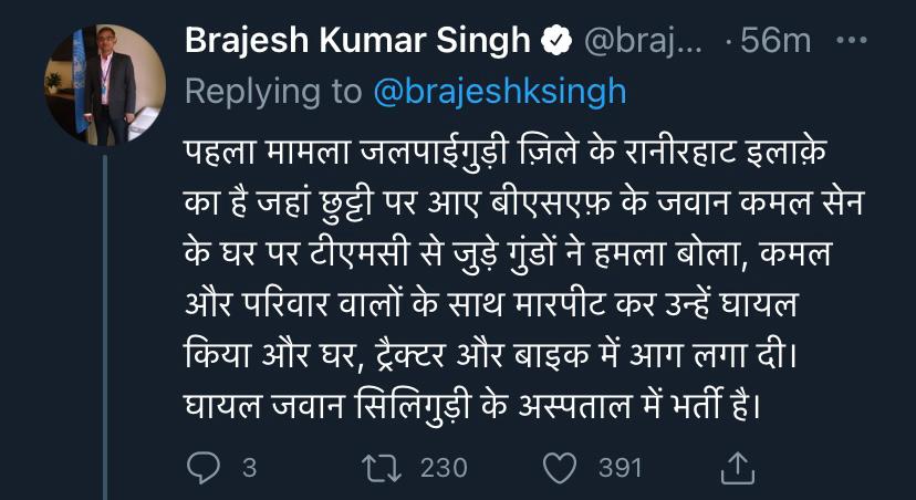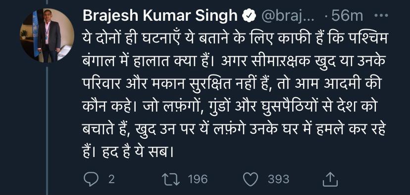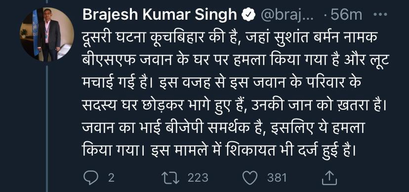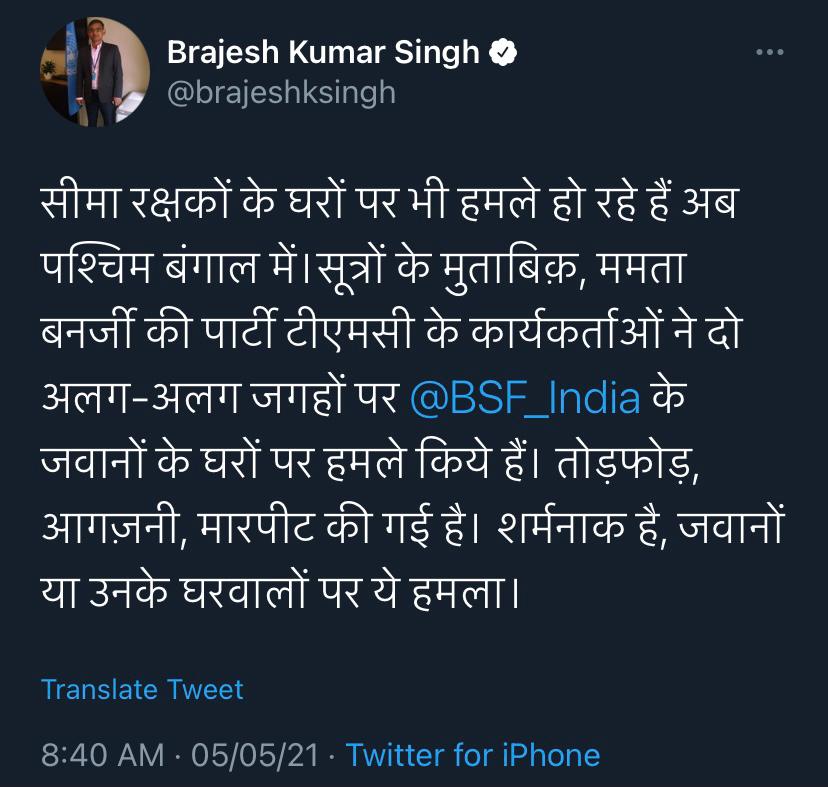 In a Twitter thread, the Managing Editor of the Network18 group Brajesh Kumar Singh has revealed that in a shameful act the houses of BSF jawans have been attacked, plundered and ransacked allegedly by the TMC goons.