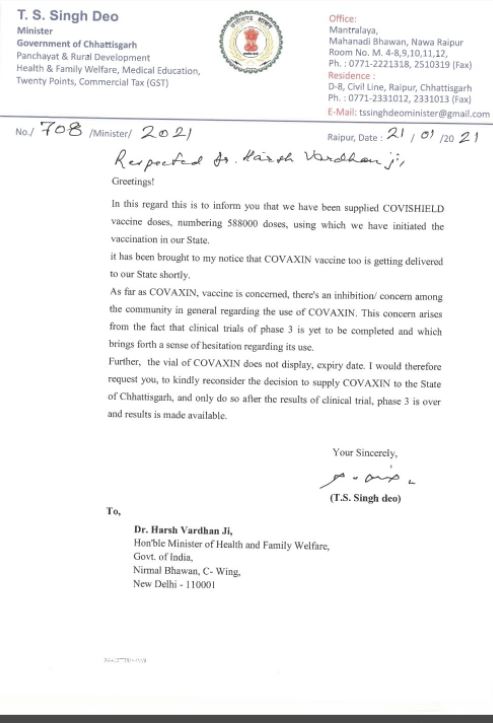In the letter to the Union Health Minister dated January 21, 2021, TS Singh Deo, who is one of the senior-most Congress leaders from the state had said that there was an “inhibition among the community” regarding Covaxin, as the vaccine had been given emergency use authorization before the completion of third phase human trials. Deo further claimed that Covaxin vials did not carry expiry dates on them. He had requested the Union health minister to halt the supply of COVAXIN to the state ‘until these issues are addressed to the satisfaction of the state’s Health Department’.