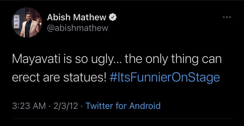 A tweet put out by the comedian in September 2012 has reappeared on Twitter, inviting a massive backlash against Abish Mathews. In the tweet, Abish Mathew had called the Dalit leader as ‘ugly’ and had shared offensive sexual innuendos.