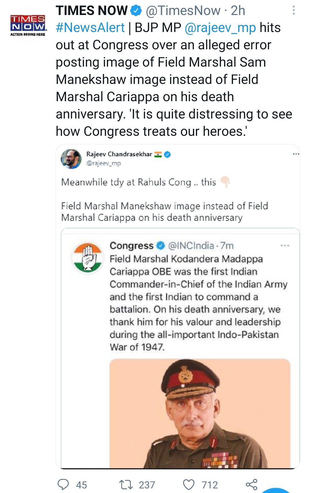 So Congress used the image of Maneckshaw Sir and tweeted on the De@th Anniversary of Cariappa Sir.