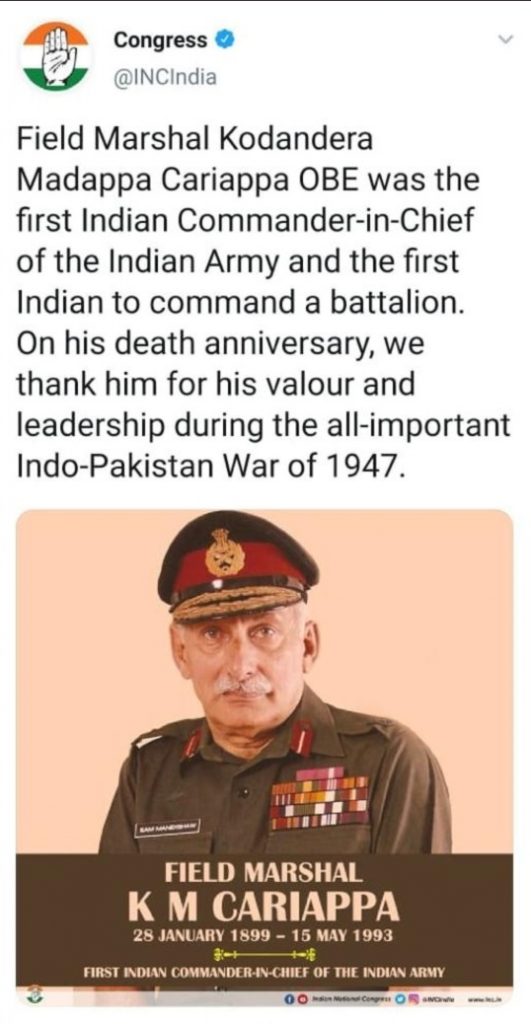 Instead of attaching Field Marshal Cariappa’s image in its tribute post, the Congress party posted an image of Field Marshal Sam Manekshaw in his place.