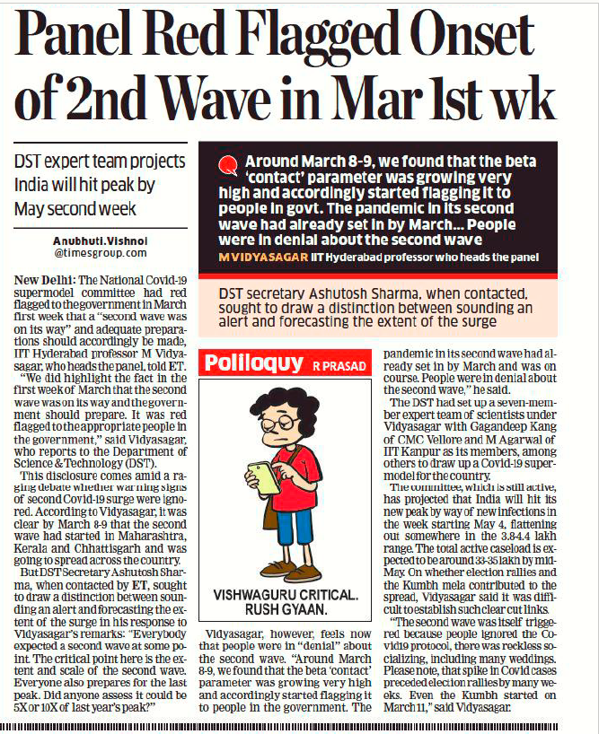 In an article titled, “Panel red-flagged onset of 2nd wave in March 1st week,” and published on Friday, ET had quoted the head of the National Coronavirus supermodel committee Professor M Vidyasagar. “We did highlight the fact in the first week of March that the second wave was on its way and the government should prepare. It was red-flagged to the appropriate people in the government,” the article quoted the IIT Professor as saying.