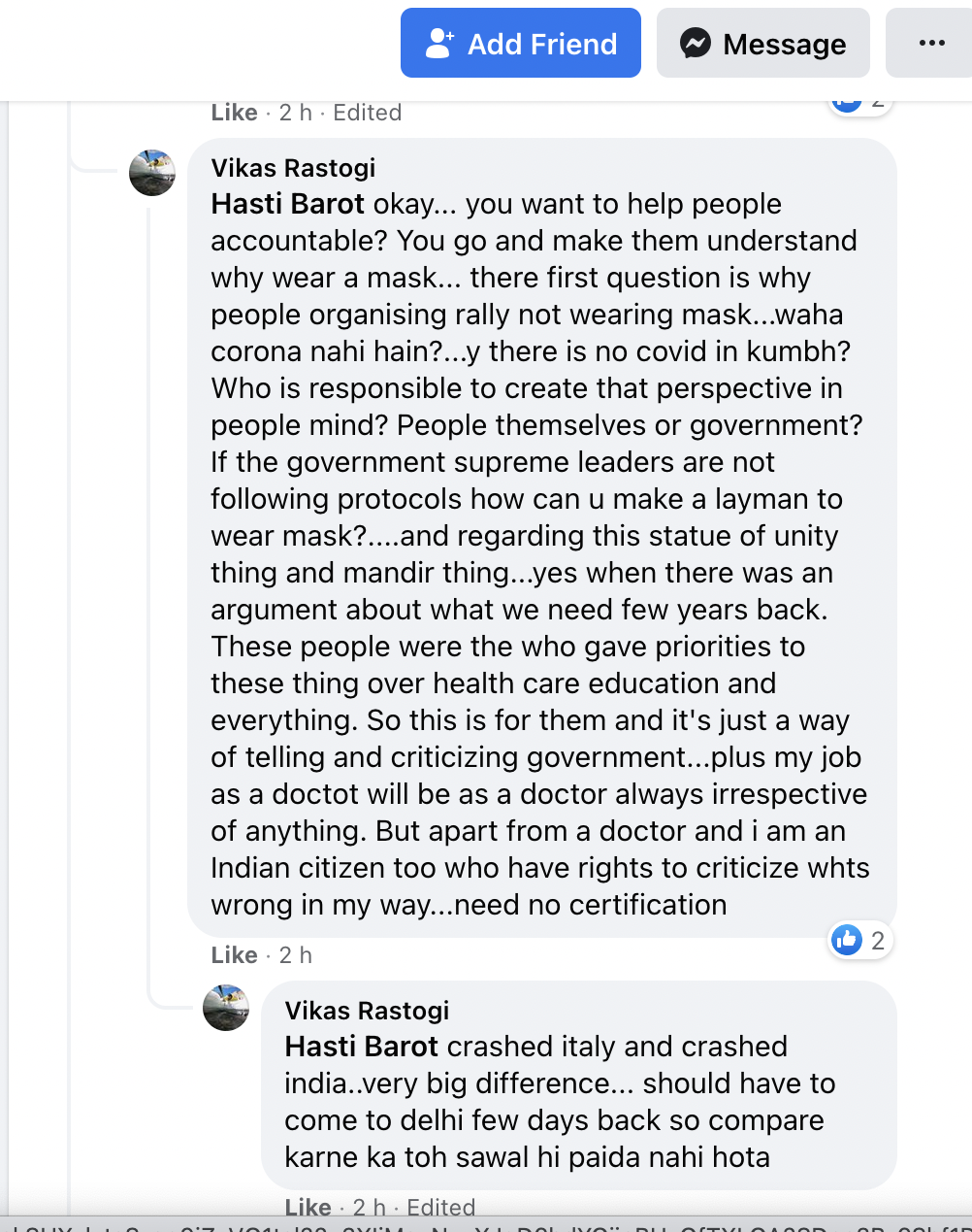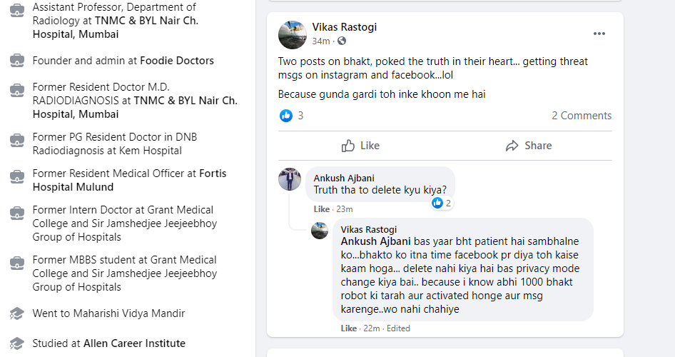 The big concern regarding Dr Rastogi, or any such doctors with a similar mentality, is that they are at risk of potentially letting their politics guide their medical practice. Will someone like Dr Rastogi, who calls PM Modi a murderer, give proper medical advice and treatment to the so-called “Bhakts”? Not according to their posts on Facebook, which reveal a clear contempt towards any supporters of the sitting Prime Minister, even going as far as to blame the “Bhakts” for India’s COVID-19 miseries.