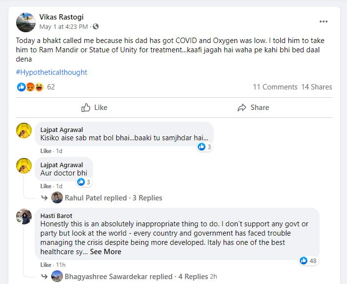 Meet Dr Vikas Rastogi, Assistant Professor, Department of Radiology at Topiwala National Medical College, B.Y.L. Nair Charitable Hospital. In a Facebook post on May 1, Dr Rastogi gives us an insight into his mind, writing about a hypothetical situation with a Modi supporter patient. In his post, Rastogi writes, “Today a bhakt called me because his dad has got COVID and Oxygen was low. I told him to take him to Ram Mandir or Statue of Unity for treatment…kaafi jagah hai waha pe kahi bhi bed daal dena.”