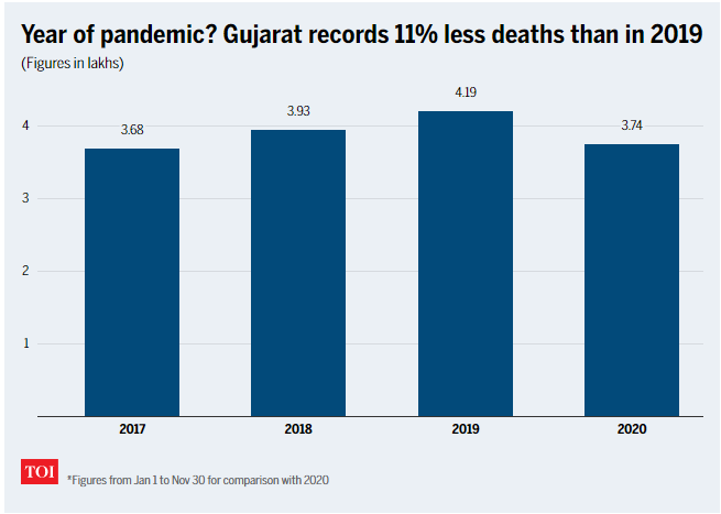 According to the Times of India report, Gujarat had recorded 3.68 lakh deaths in 2017, 3.93 lakh in 2018, 4.19 in 2019 and 3.74 lakhs in 2020 (between January and November). Based on simple calculations based on the yearly growth rate in the number of deaths, Gujarat was expect to have somewhere between 4,46,235 to 4,47,073 deaths in 2020 (barring the month of December). But as we know, the number was significantly lower than that despite the pandemic.