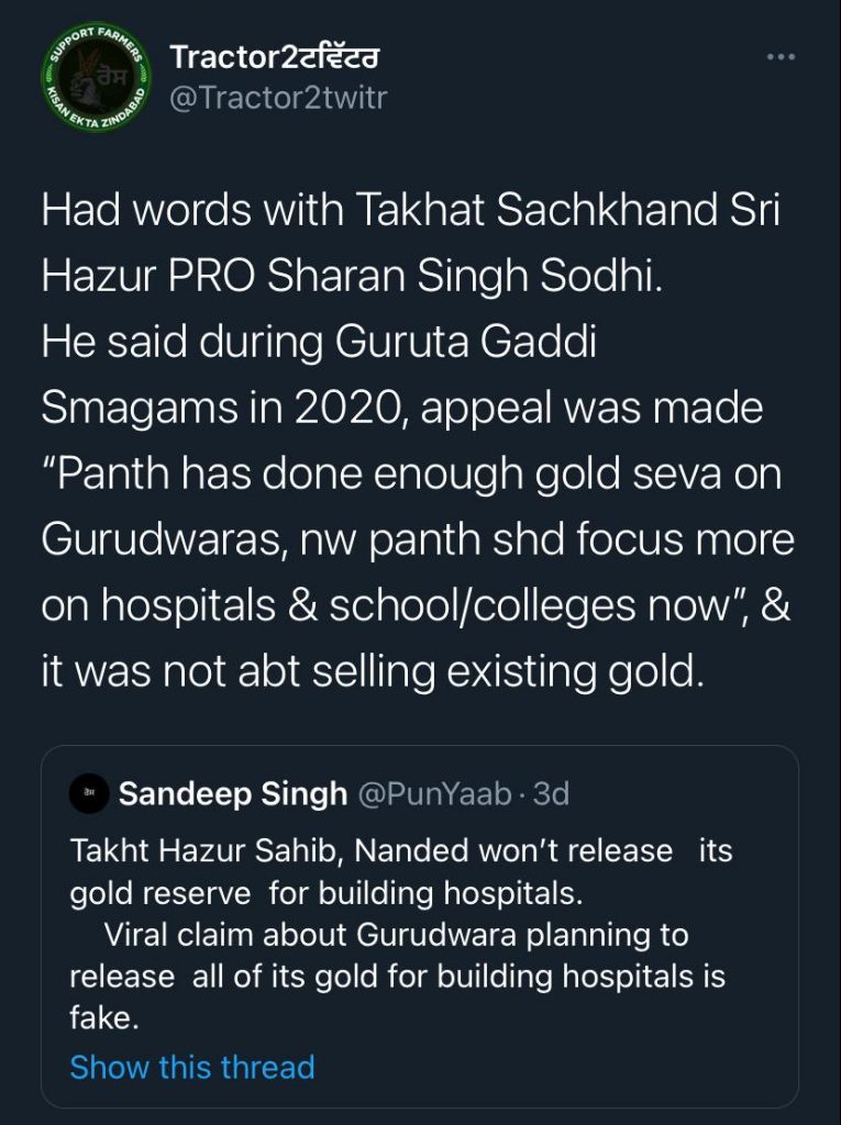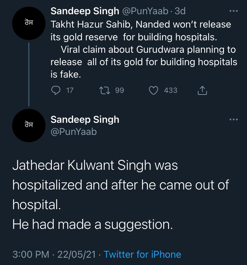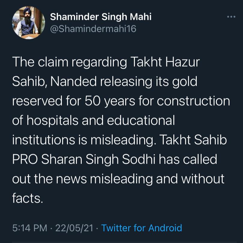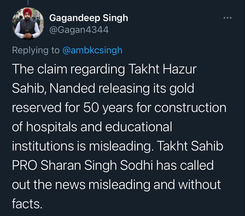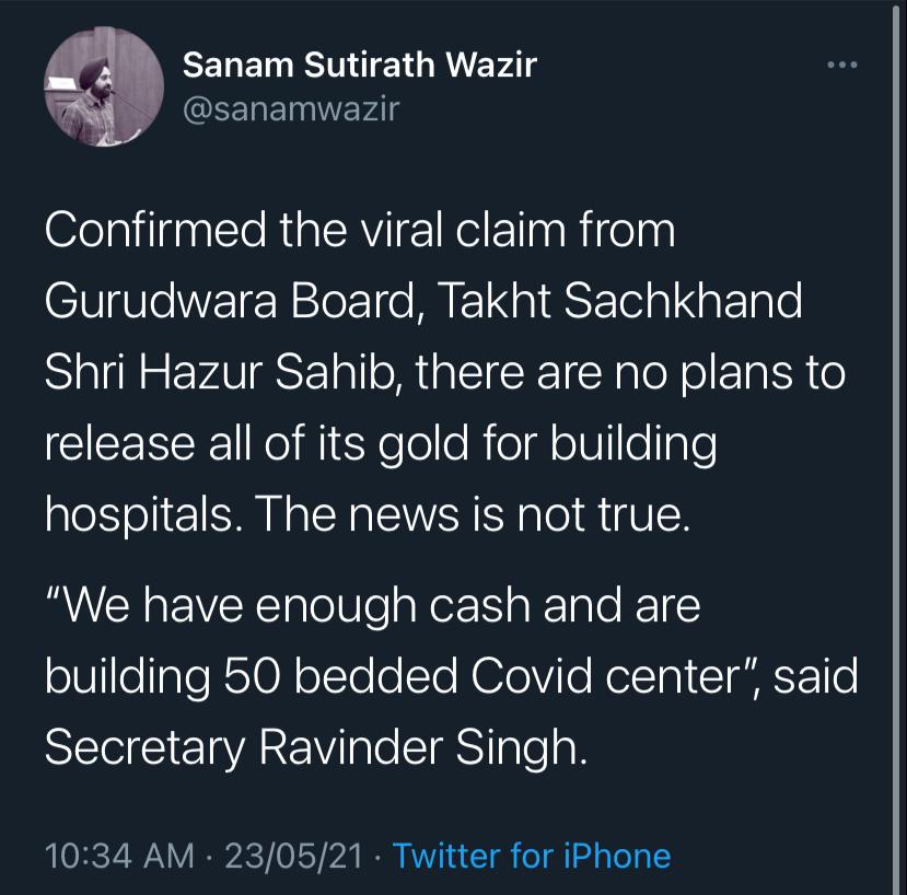 Sanam Wazir a journalist and human rights activist Tweeted saying, “Confirmed the viral claim from Gurudwara Board, Takht Sachkhand Shri Hazur Sahib, there are no plans to release all of its gold for building hospitals. The news is not true.”