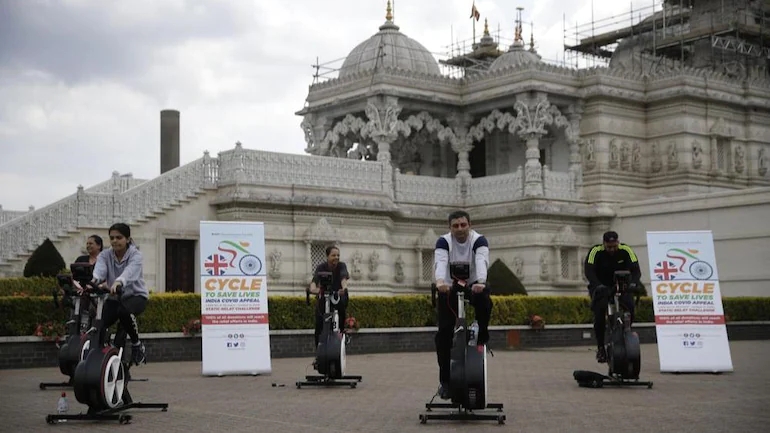 The stationary bike ride at the Shri Swaminarayan Mandir in London’s Neasden neighborhood is one of many fundraising drives taking place across the U.K. as the Indian diaspora seeks to help India battle the raging Coronavirus pandemic.