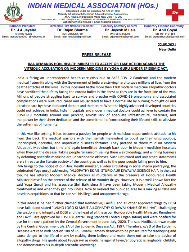 The IMA said in a statement, “Therefore, under section 3 of the Epidemic Disease Act with section 188 of the Indian Penal Code, Ramdev deserves to be prosecuted for disobeying and causing danger to the life of many by making them believe and make them not to take the advice of allopathy drugs. His quote about Favipiravir as medicine against fever/antipyretic is laughable, childish and demonstrates his in-depth scientific knowledge.”