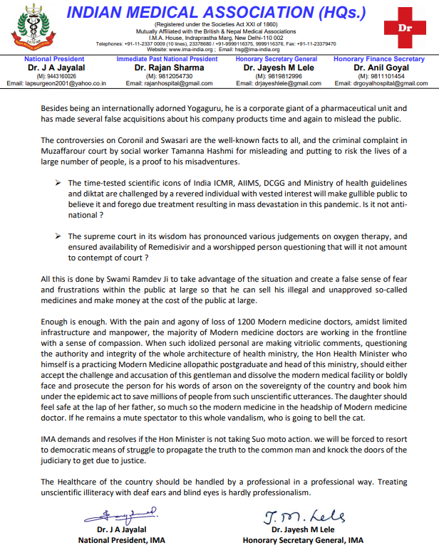 Incidentally, the letter was signed by National President of the IMA Dr. J.A.Jayalal and Honorary Secretary General Dr. Jayesh M Lele. Dr. Jayalal was embroiled in a controversy earlier this year after he has said that he wanted to use hospitals to convert Hindus to Christianity.