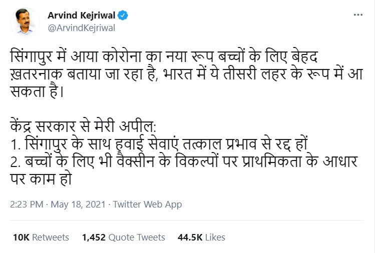 Kejriwal had spread multiple misinformations in tweet. Apart from claiming about the ‘Singapore strain’ he had also asked the government to cancel flights to the city-state. Civil Aviation minister Hardeep S Puri had clarified that there are no civilian flights operational between India and Singapore since March 2020.